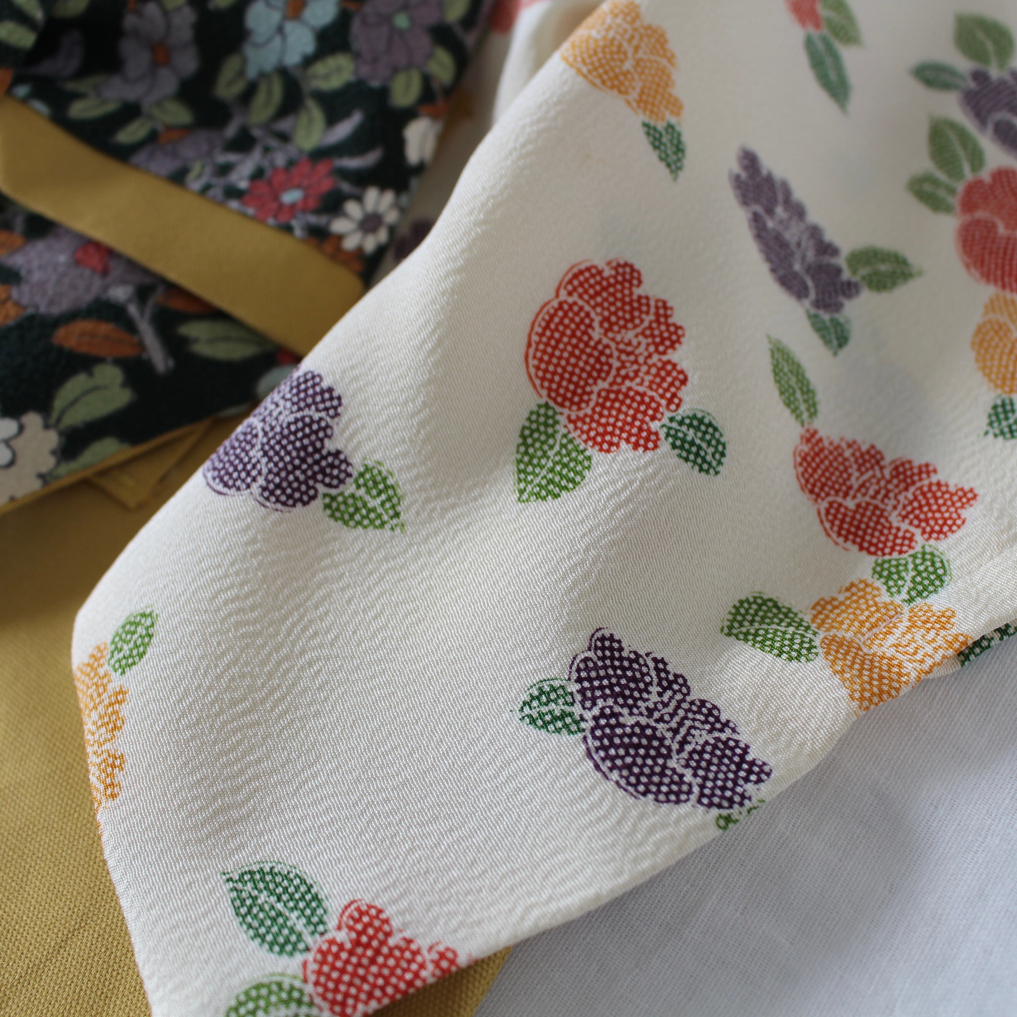 kaenで使用している着物は一度洗いにかけてから縫製しています。その為お洗濯後の縮みは少ないですが、中でも絞りや縮緬のお着物は縮みやすいです。この二つに限らず、陰干しで乾かした後はスチームアイロンをおかけください。質感や艶感も戻ります。