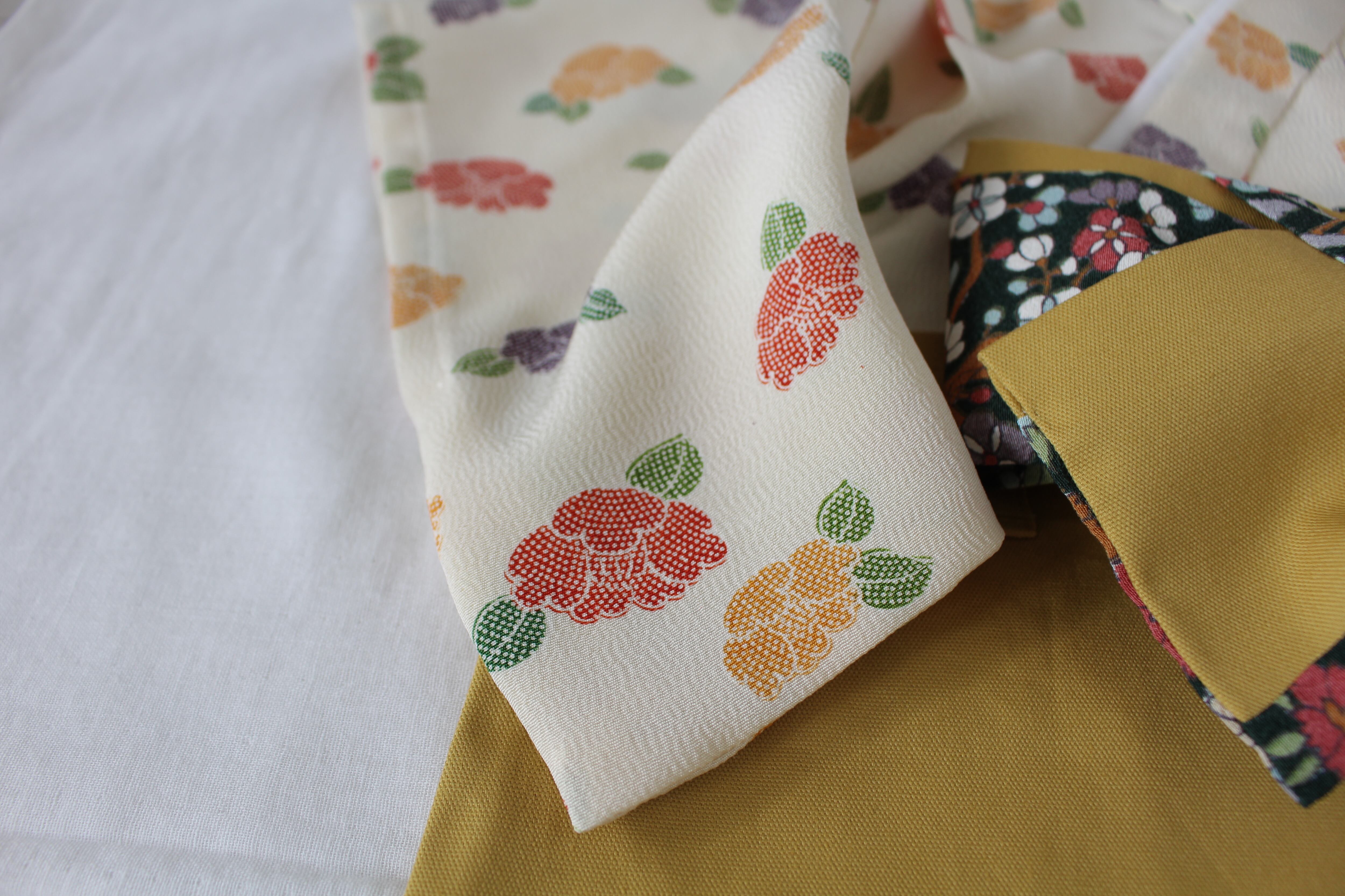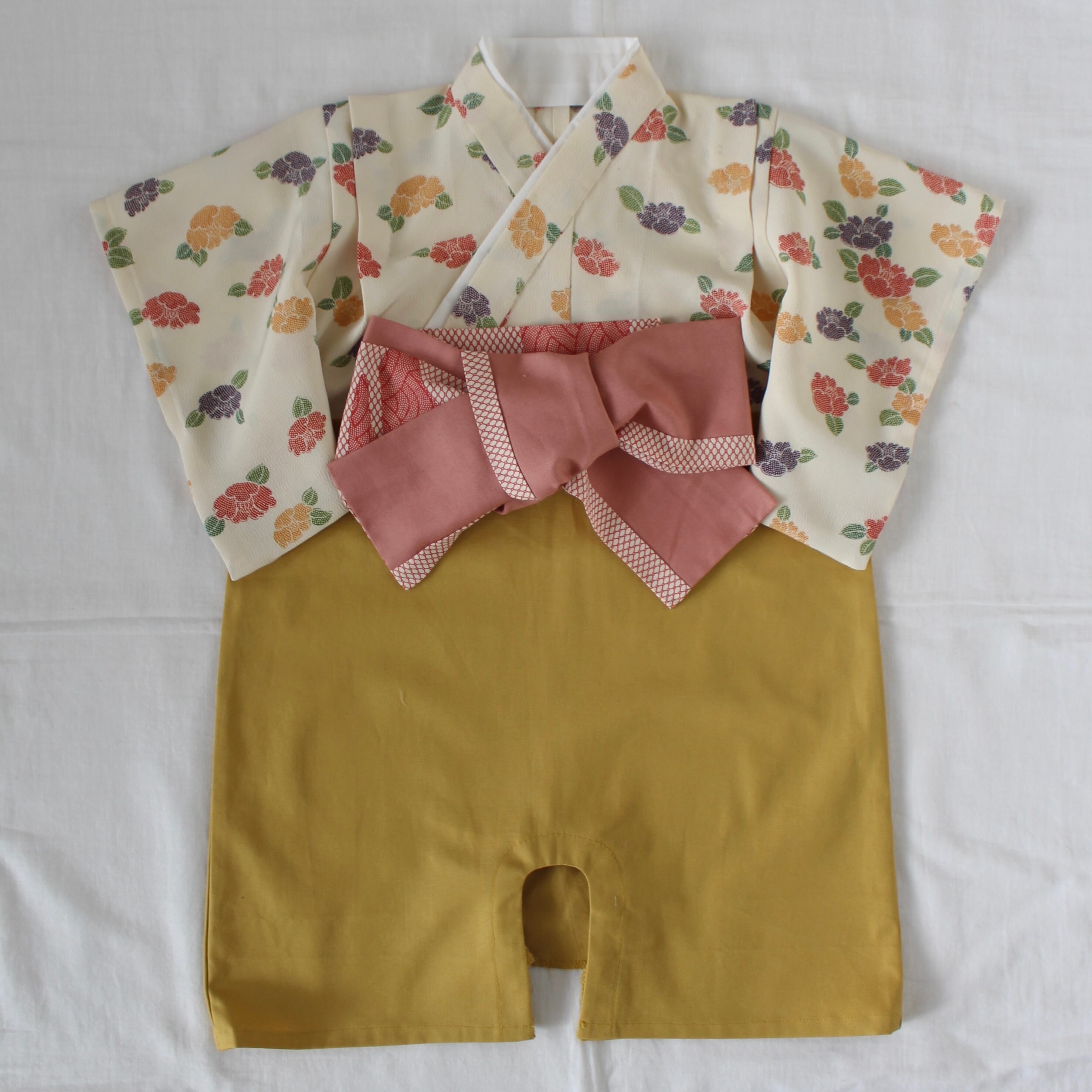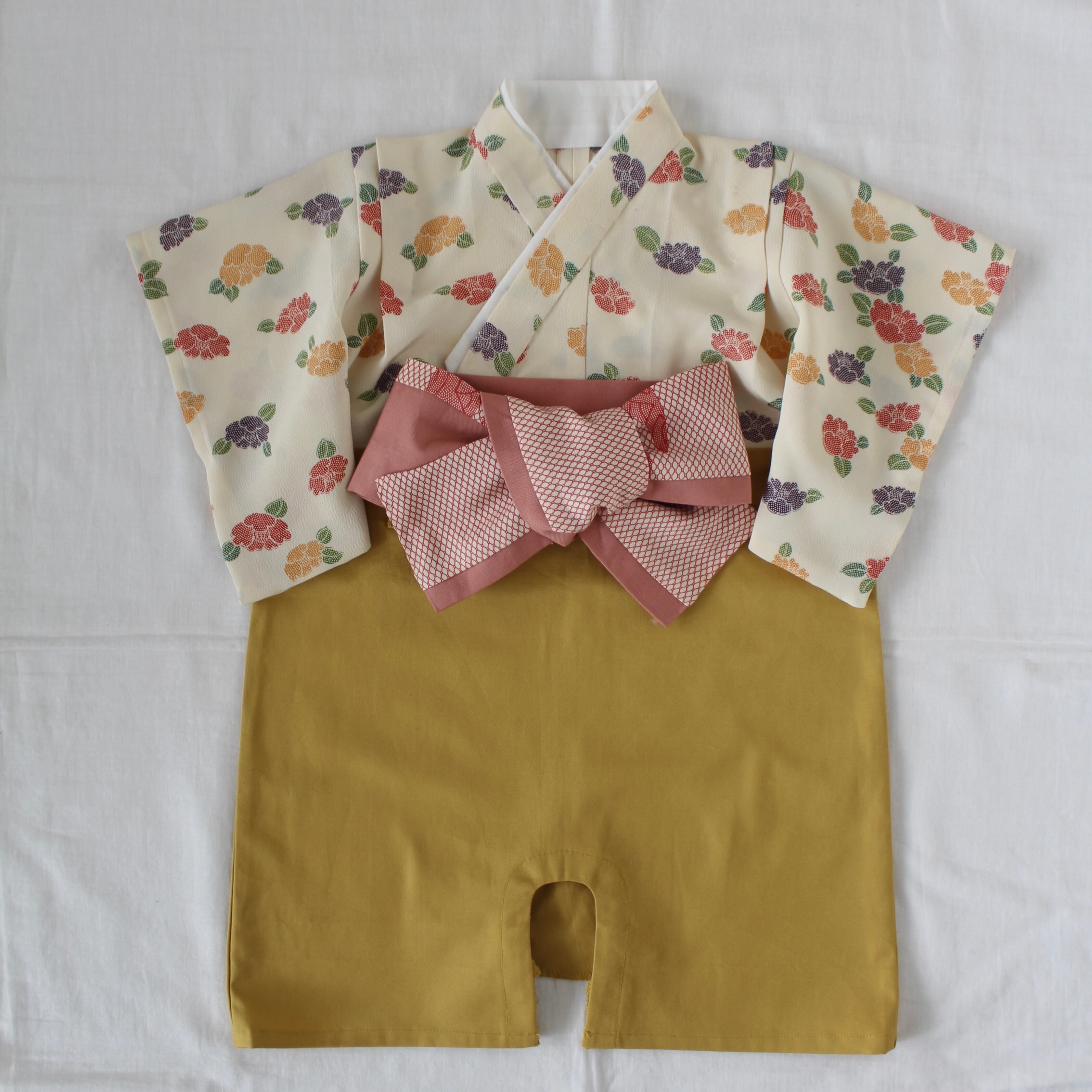 上衣と下衣はウエスト部分で繋がっています。上衣は椿模様の着物、下衣はオックス生地(辛子色)を使用しています。